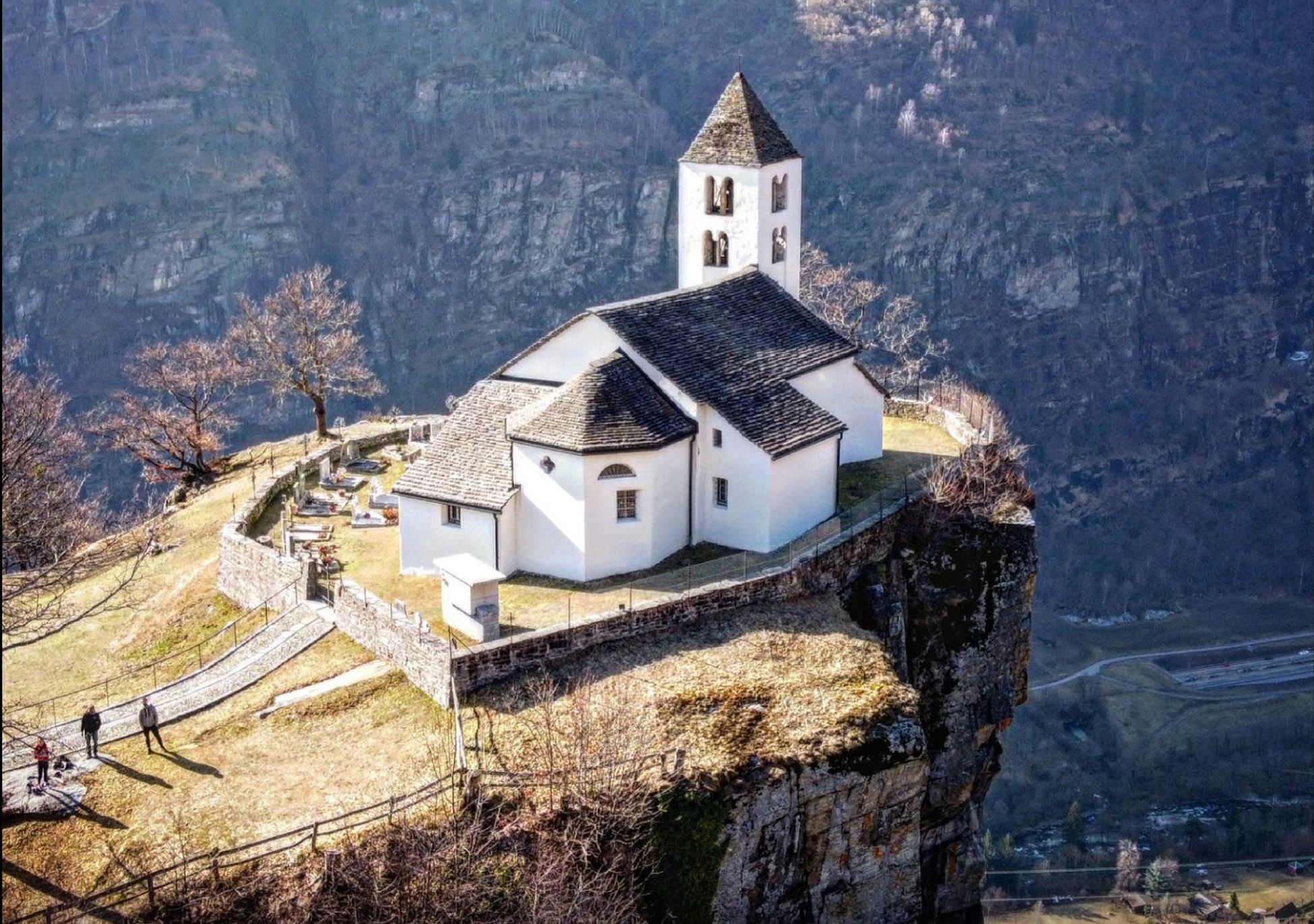Aus dem Tal von der Autobahn aus ist diese markante auf einem Felsvorsprung stehende Kirche zu sehen